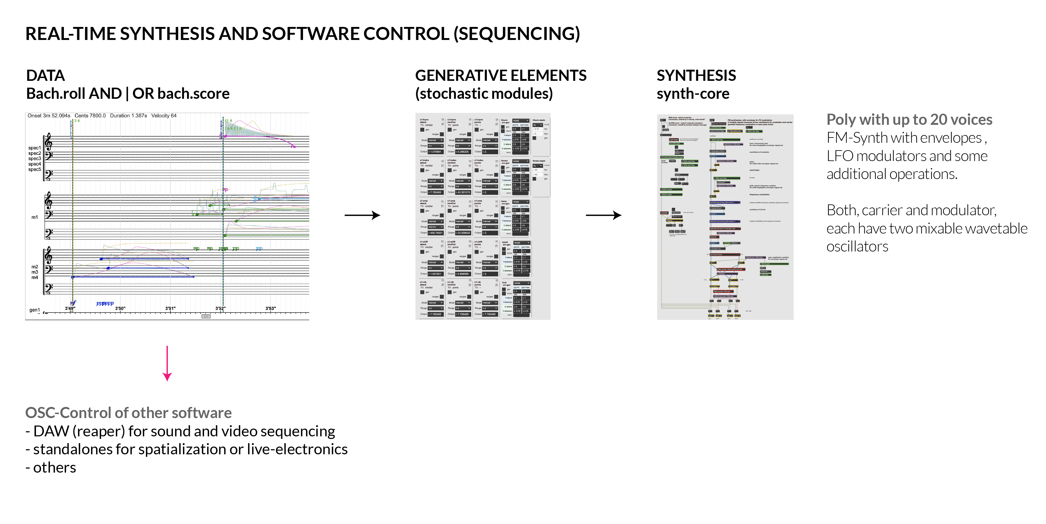 Compositionally, it is about the development and organization of artistic production space and ultimately a specific operational space of my aesthetic practice. In the interplay of the different representations and the acoustic response always possible in real-time, dynamic-situational structural and experimental affordances emerge, among other things, with which I can deal in a groping-perceptive as well as strictly formalizing way.