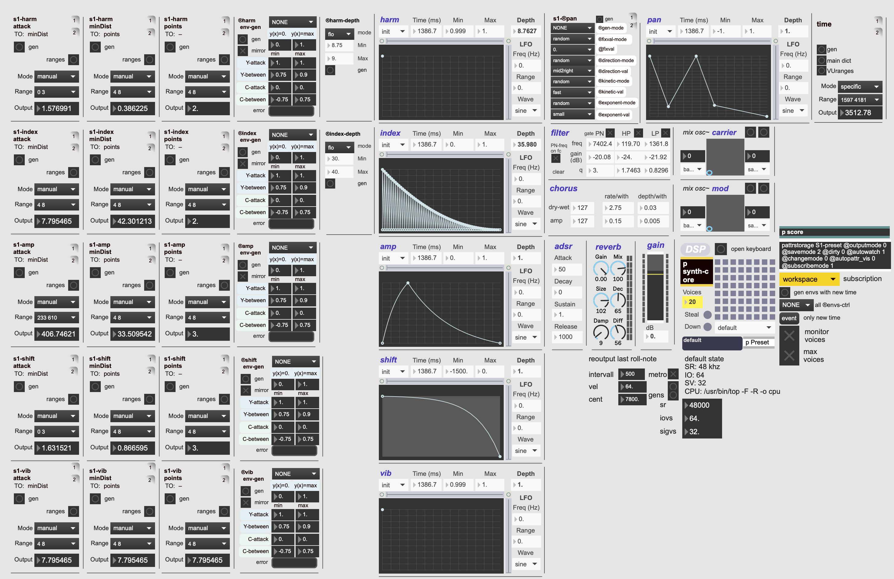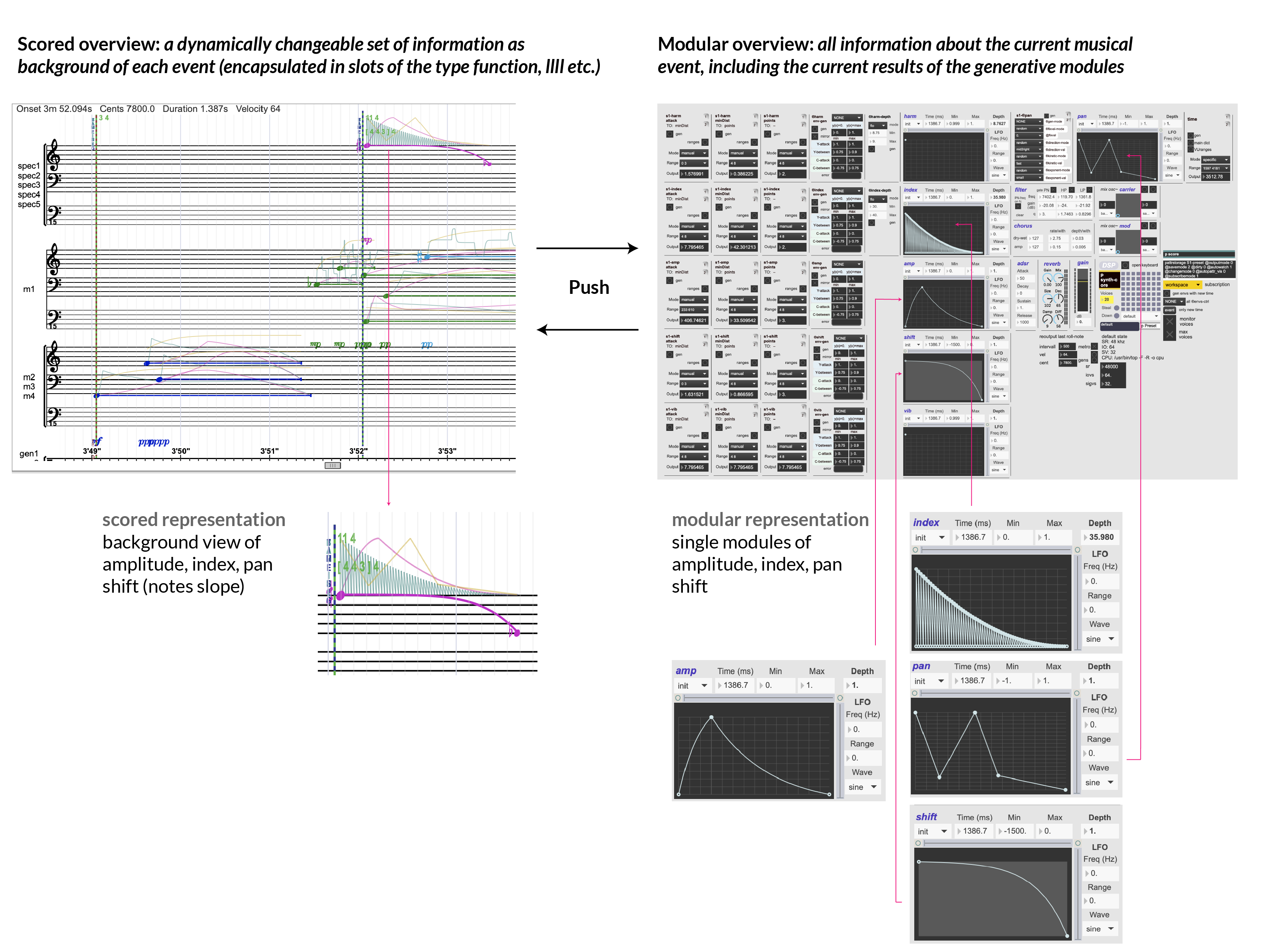Technically, it is a computer program that I am continuously developing since I wrote its first version during my artistic residency in Berlin (February to July 2019). It has two core functions: a polyphonic synthesizer and a representation and notation environment. The latter is divided into two workspaces. One is comparable to the interface of a modular synthesizer, while the other is used for notation, representation and algorithmic processing.
